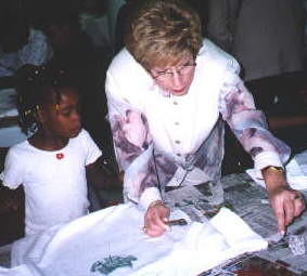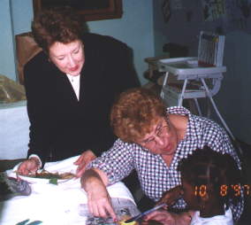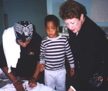 President Eileen Rodak and Carol Holland help one of the children in the Center get started on her sweatshirt.
